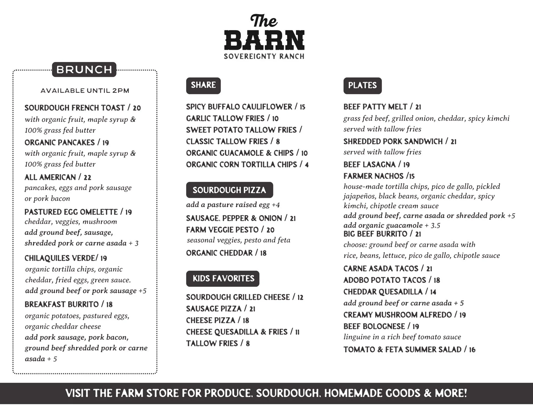 Below is a typical menu for The Barn Restaurant during their regular business hours. The event menu will be a variation of this and offer more vegan and gluten free options, but this can give a good idea of the types of things you might see on the menu at Food Is Medicine.